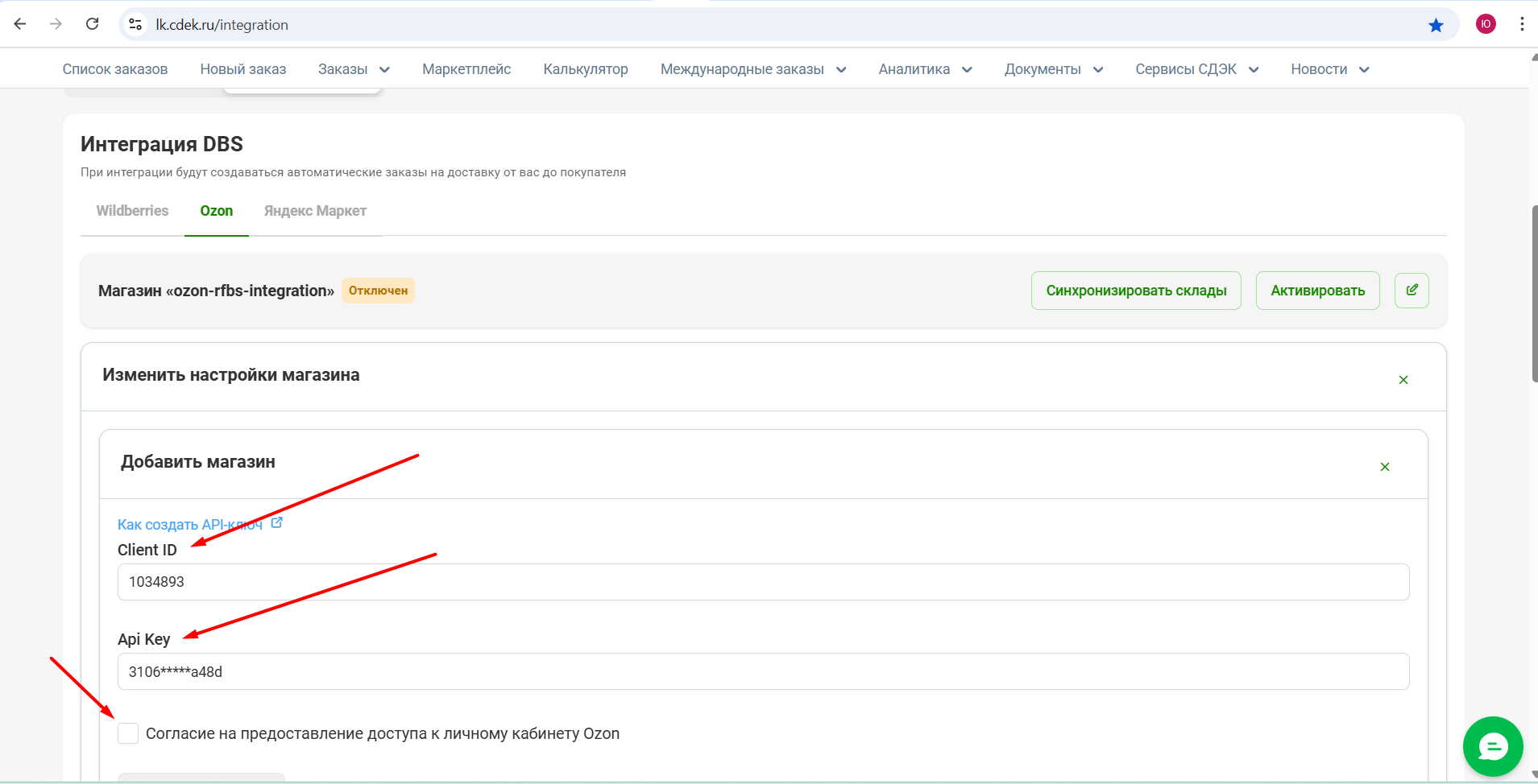 В случае успешной проверки API-ключа, будет создан новый интегрированный магазин и станет доступна форма настройки интеграции.