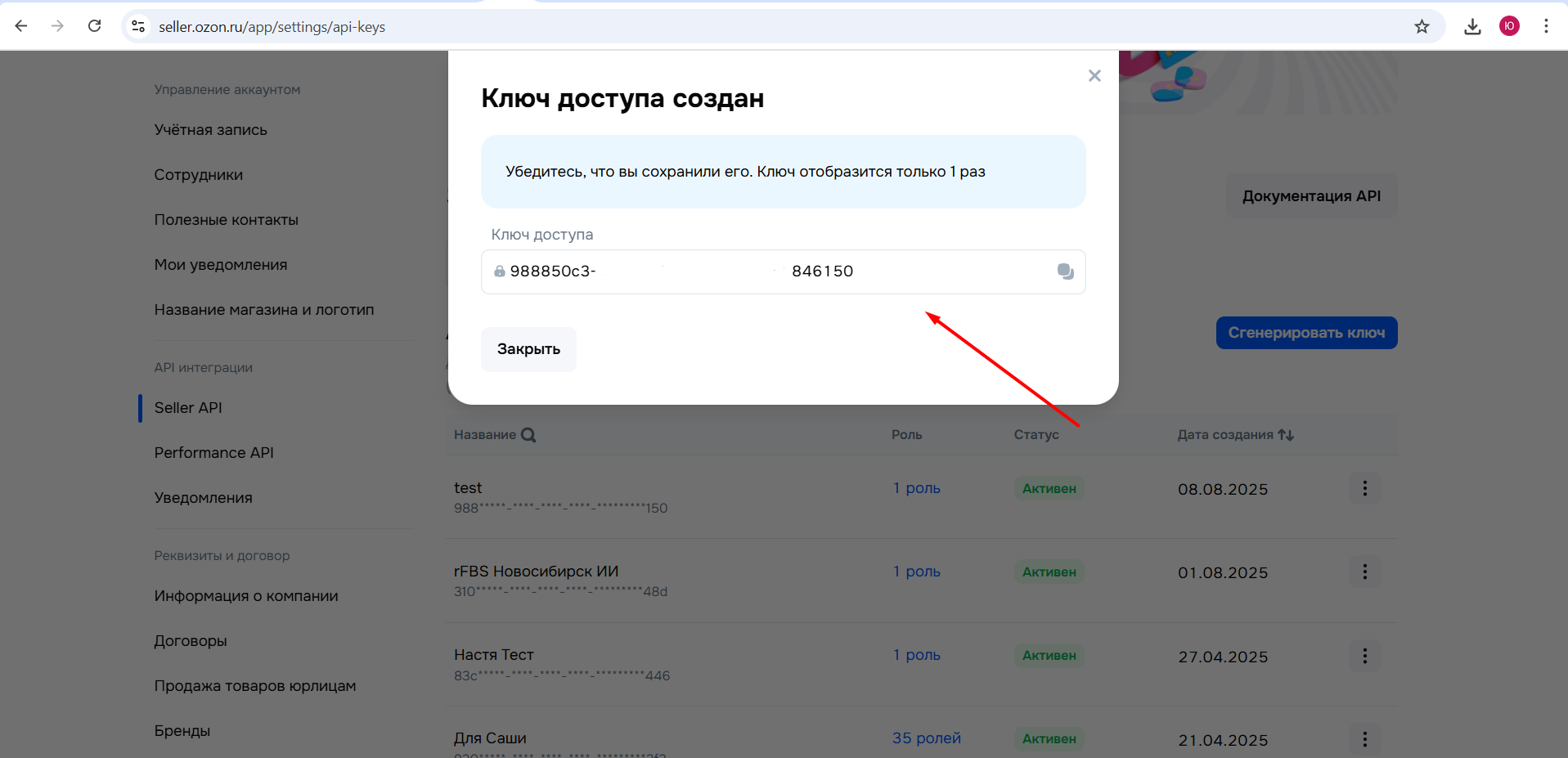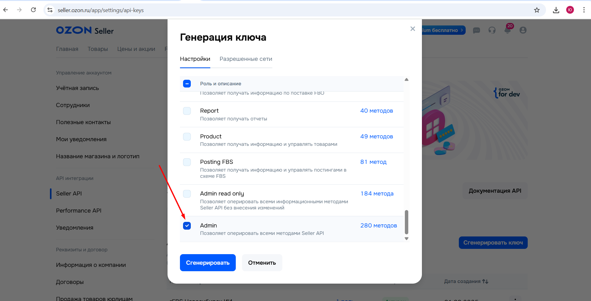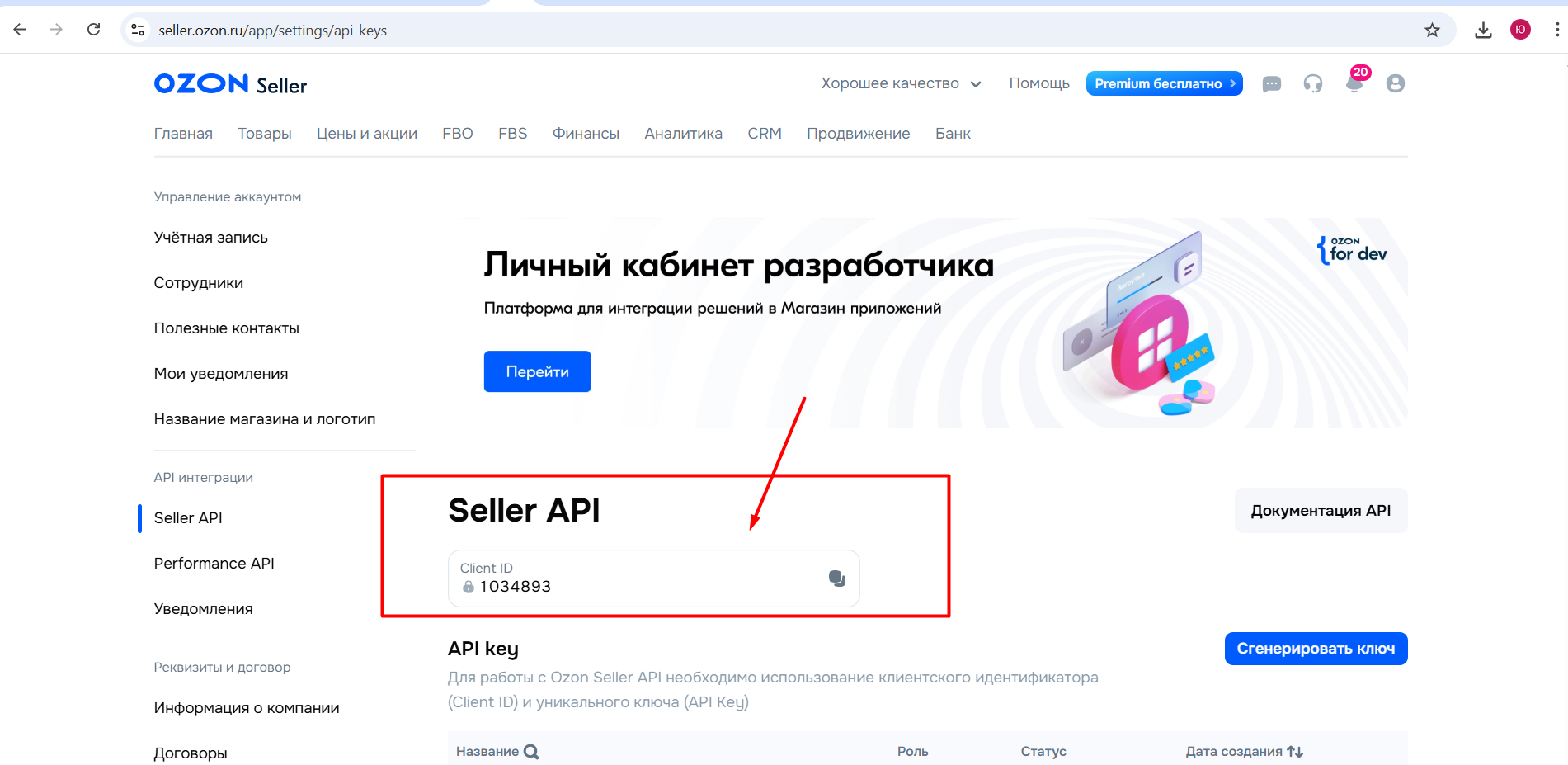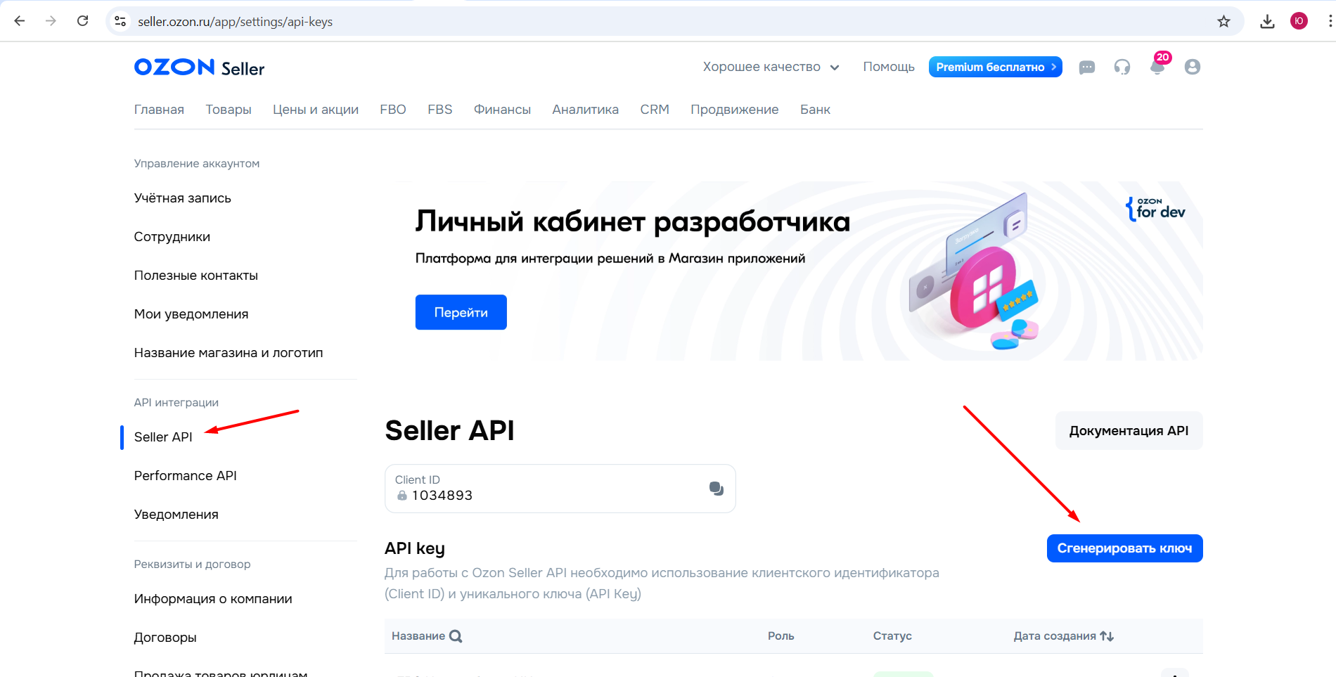 Для генерации токена, в Личном кабинет партнера Ozon необходимо нажать
