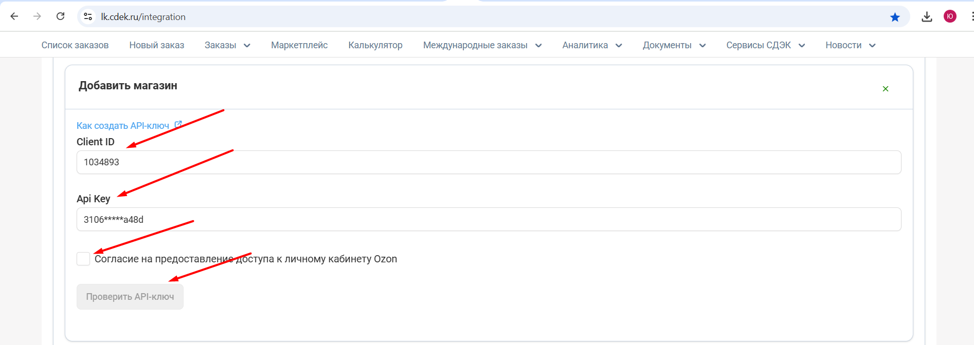 После заполнения поля, необходимо подтвердить ознакомление с согласием на передачу данных и отправить токен на проверку, нажав Проверить API-ключ.