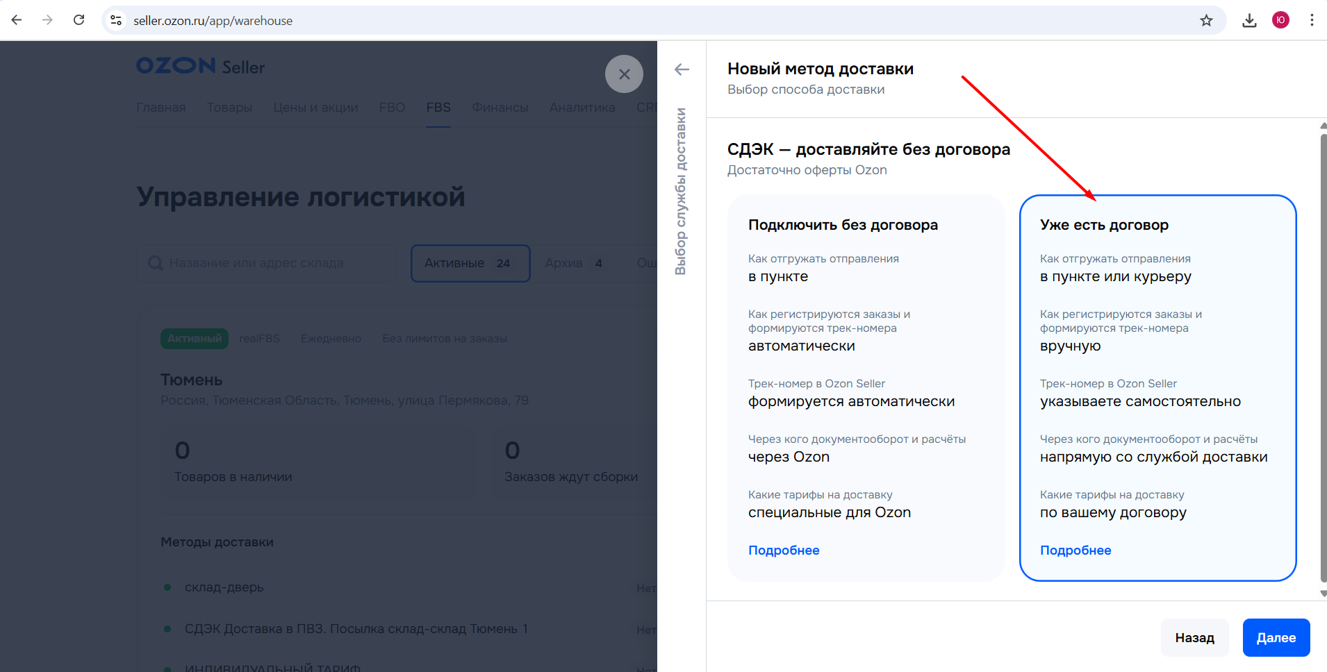 Если вы не создавали склады в Ozon, то сделайте это по инструкции.