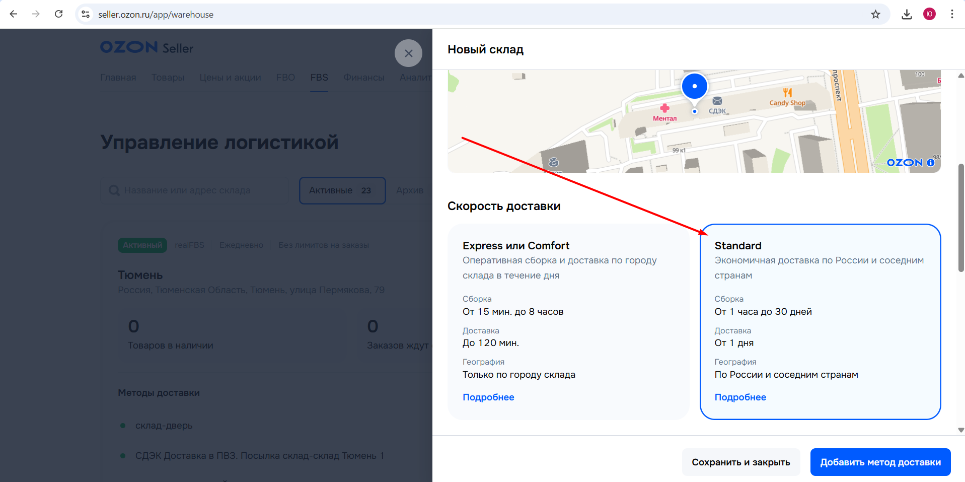 Скорость доставки в личном кабинете Ozon нужно указывать для realFBS - Standard.