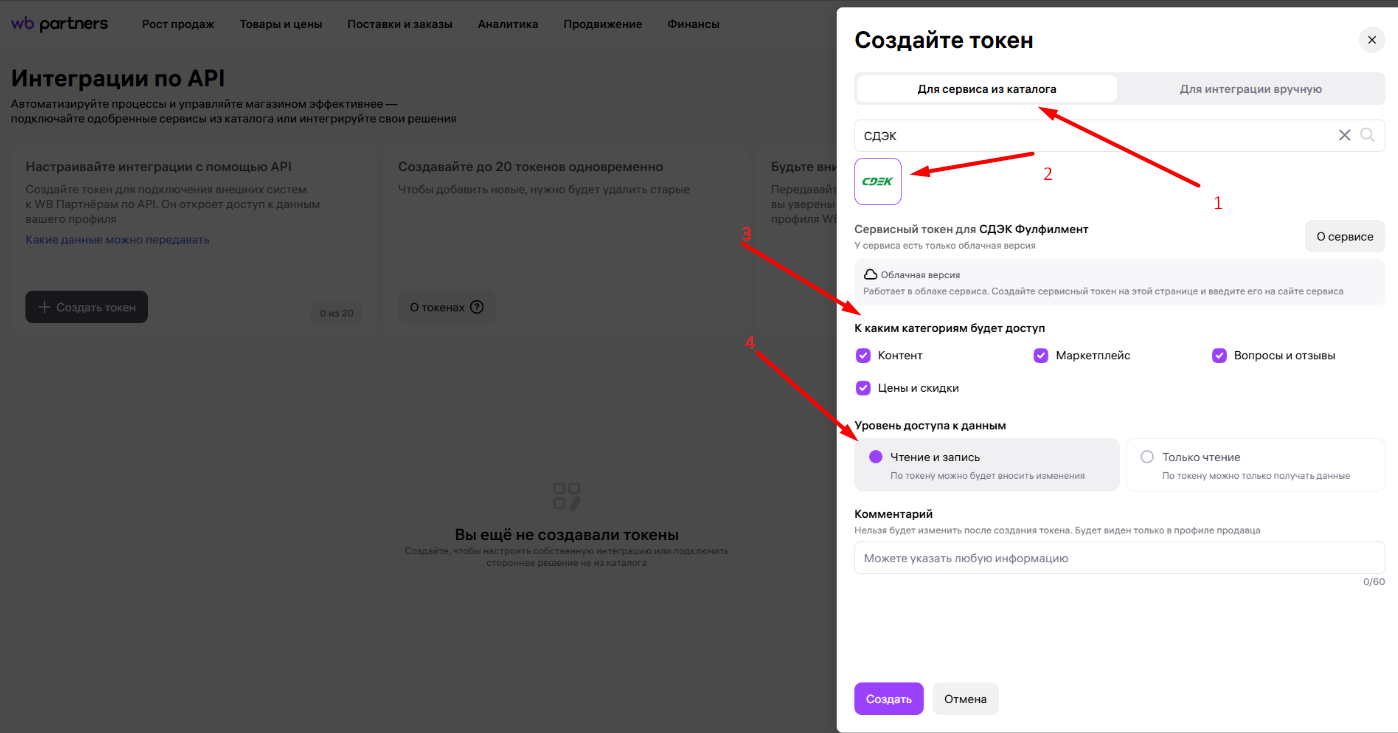 Для корректной работы необходимо выбрать вкладку Для сервиса из каталога, выбрать компанию СДЭК. Токен должен иметь сразу три категории доступа: Контент, Маркетплейс и Цены и скидки и должен быть выбран Уровень доступа к данным - Чтение и запись.