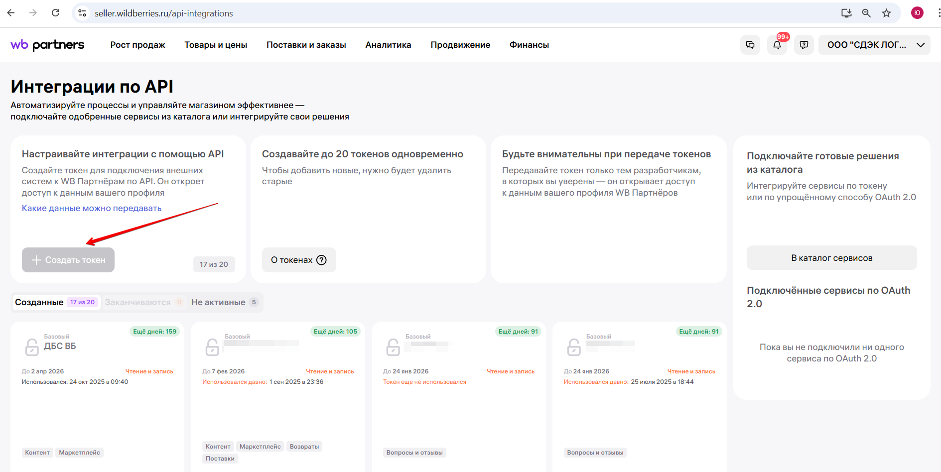 При недоступности функционал создания нового токена, необходимо проверить права доступа используемого аккаунта или обратиться в техническую поддержку Wildberries.